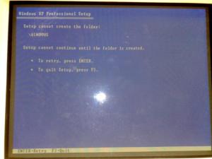 Ok, I have just tested again. With the orginal Volume License version of WinXP SP2 CD i have, this PC is able to install with no additional storage controller drivers. I have copied this XP CD to my hard drive, path C:\XPCD and then run the setupmgr to create a new WINNT.SIF from scratch and copied this WINNT.SIF in to the i386 folder in that directory. I have not configured or added anything beyond anything put in by this program (I have obviously removed company specific info in the below code, entries in the SIF file are correct) The WINNT.SIF is shown below: ;SetupMgrTag [Data] AutoPartition=1 MsDosInitiated="1" UnattendedInstall="Yes" floppyless="1" winntupgrade="no" win9xupgrade="no" EulaComplete="1" [GuiUnattended] AdminPassword=* EncryptedAdminPassword=NO AutoLogon=Yes AutoLogonCount=1 OEMSkipRegional=1 TimeZone=85 OemSkipWelcome=1 [UserData] ProductKey=Our Key here FullName="Company here" OrgName="Company here" ComputerName=* [Display] BitsPerPel=24 Xresolution=1024 YResolution=768 Vrefresh=60 [TapiLocation] CountryCode=44 Dialing=Tone AreaCode=01895 [RegionalSettings] LanguageGroup=1 SystemLocale=00000809 UserLocale=00000809 InputLocale=0809:00000809 [Branding] BrandIEUsingUnattended=Yes [URL] Home_Page=intranet here [Proxy] Proxy_Enable=0 Use_Same_Proxy=1 [Identification] JoinWorkgroup=WORKGROUP [Networking] InstallDefaultComponents=No [NetAdapters] Adapter1=params.Adapter1 [params.Adapter1] INFID=* [NetClients] MS_MSClient=params.MS_MSClient [NetServices] MS_SERVER=params.MS_SERVER [NetProtocols] MS_TCPIP=params.MS_TCPIP [params.MS_TCPIP] DNS=Yes UseDomainNameDevolution=No EnableLMHosts=Yes AdapterSections=params.MS_TCPIP.Adapter1 [params.MS_TCPIP.Adapter1] SpecificTo=Adapter1 DHCP=Yes WINS=No NetBIOSOptions=0 DNSDomain=domain here [GuiRunOnce] "undoren.cmd" [SetupParams] UserExecute="binifix4.cmd C:" I have then used your tool to compile this set of files to the USB Key which i freshly formatted using the HP Tool and formatted it to NTFS and im still getting the following screen: Setup Cannot Create the folder: \WINDOWS Setup cannot continue until the folder is created To retry press enter To quite press F3 Im stumped now -