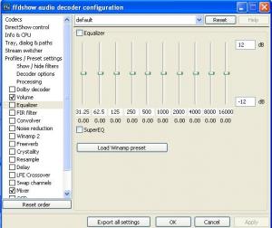 1. Open your Start menu, select All Programs, find FFDShow and choose ffdshow audio decoder, as shown in the pic. Don't forget to tick Equalizer to enable it first. The ffdshow video decoder screen gives a few options as well. Now, the good thing about this program is that if you configure your files/filters to go through FFDShow (Codecs sub-section for audio/video decoder screen), you should experience a smaller CPU usage and a smoother playback. I've been using it since 2004 (combined with K-Lite and MPC for the past 3-4 years) and the only files it doesn't play for me are the corrupted ones. Cheers