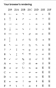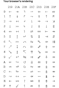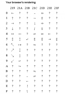 Firefox 3.x + KernelEx: MathML not working properlydiamant replied to diamant's topic in Windows 9x Member Projects Regarding http://www.w3.org/Math/testsuite/build/main/Characters/Blocks/02190_Arrows-full.xhtml: Does it look like the following screenshot (with ? instead of squares with numbers within)? Those files I have in the the mozlla firefox\res\fonts folder from Firefox 2, too. They are also readable by MS Word and Firefox. They are not fonts themselves; maybe only properties or settings. P.S.: Inspired from the tip with missing fonts I found for the moment a font called arialuni.TTF on my MS-Word-2000 CD. It has 23 MB(!). After installing the font I get many more symbols than on my first two screenshots; see the actual screenshot from Firefox 3.5.19 above. Only some very "exotic" and rare symbols (column 21F and partially 21E) are missing. It seems that I get with the font arialuni.TTF the same result as you got already "per default". Did/do you have already the font arialuni.TTF? I will now try some of the other fonts you suggested, and compare with arialuni.TTF.