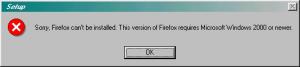 OS: Win98SE (rus) KernelEx 4.0 RC2: - OpenOffice 3: Ok! - Firefox 3.5.1 (3.5.2): installation Ok, browsing Ok, PRINTING DOESN'T WORK at all (Print preview: "printer is not found", while printing I get clean paper without any letter or image); -Firefox 2.0.0.20: Ok; KernelEx 4.0 Final: - Firefox 3.5.1 (3.5.2): CAN NOT EVEN INSTALL. Error message is: "...This version of Firefox requires Microsoft Windows 2000 or newer" (please see screenshot in the attachment) - ZoneAlarm v6: DOES NOT start (no icon in the tray, no control...) What could be the reasons and what can I try to do? -- Thank you.