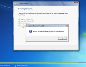 Hi all, I've spent a lot of time searching and haven't been able to find anything, but I keep getting the same error with my unattended whenever I try and put a RunSynchronous. Other then that it has been working fine and even my FirstLogonCommands are working great. Here is a dumb-ed down basic version of my file, I can't even get this working! And attached is the error I get.... An error occurred while querying for pending operations <?xml version="1.0" encoding="utf-8"?> <unattend xmlns="urn:schemas-microsoft-com:unattend"> <servicing></servicing> <settings pass="oobeSystem"> <component name="Microsoft-Windows-Shell-Setup" processorArchitecture="x86" publicKeyToken="31bf3856ad364e35" language="neutral" versionScope="nonSxS" xmlns:wcm="http://schemas.microsoft.com/WMIConfig/2002/State" xmlns:xsi="http://www.w3.org/2001/XMLSchema-instance"> <ShowWindowsLive>false</ShowWindowsLive> <RegisteredOrganization>Fred Health Pty. Ltd.</RegisteredOrganization> <RegisteredOwner>Fred Health Pty. Ltd.</RegisteredOwner> <TimeZone>AUS Eastern Standard Time</TimeZone> <FirstLogonCommands> <SynchronousCommand wcm:action="add"> <Order>1</Order> <Description>RegTweak</Description> <CommandLine>cmd /c REGEDIT /S c:\Misc\Regtweaks.Reg</CommandLine> <RequiresUserInput>false</RequiresUserInput> </SynchronousCommand> </FirstLogonCommands> <DoNotCleanTaskBar>true</DoNotCleanTaskBar> </component> </settings> <settings pass="windowsPE"> <component name="Microsoft-Windows-Setup" processorArchitecture="x86" publicKeyToken="31bf3856ad364e35" language="neutral" versionScope="nonSxS" xmlns:wcm="http://schemas.microsoft.com/WMIConfig/2002/State" xmlns:xsi="http://www.w3.org/2001/XMLSchema-instance"> <DiskConfiguration> <Disk wcm:action="add"> <CreatePartitions> <CreatePartition wcm:action="add"> <Order>2</Order> <Type>Primary</Type> <Extend>true</Extend> </CreatePartition> <CreatePartition wcm:action="add"> <Order>1</Order> <Size>300</Size> <Type>Primary</Type> </CreatePartition> </CreatePartitions> <ModifyPartitions> <ModifyPartition wcm:action="add"> <Active>true</Active> <Format>NTFS</Format> <Label>Windows</Label> <Letter>C</Letter> <Order>2</Order> <PartitionID>2</PartitionID> </ModifyPartition> <ModifyPartition wcm:action="add"> <Active>false</Active> <Label>System Reserved</Label> <PartitionID>1</PartitionID> <Order>1</Order> <Format>NTFS</Format> <TypeID>0x27</TypeID> </ModifyPartition> </ModifyPartitions> <DiskID>0</DiskID> <WillWipeDisk>true</WillWipeDisk> </Disk> <WillShowUI>OnError</WillShowUI> </DiskConfiguration> <ImageInstall> <OSImage> <InstallTo> <DiskID>0</DiskID> <PartitionID>2</PartitionID> </InstallTo> <InstallToAvailablePartition>false</InstallToAvailablePartition> <WillShowUI>OnError</WillShowUI> <InstallFrom> <MetaData wcm:action="add"> <Key>/IMAGE/NAME</Key> <Value>Windows 7 ENTERPRISE</Value> </MetaData> </InstallFrom> </OSImage> </ImageInstall> <EnableNetwork>true</EnableNetwork> <UseConfigurationSet>true</UseConfigurationSet> </component> </settings> <settings pass="specialize"> <component name="Microsoft-Windows-Deployment" processorArchitecture="x86" publicKeyToken="31bf3856ad364e35" language="neutral" versionScope="nonSxS" xmlns:wcm="http://schemas.microsoft.com/WMIConfig/2002/State" xmlns:xsi="http://www.w3.org/2001/XMLSchema-instance"> <RunSynchronous> <RunSynchronousCommand wcm:action="add"> <Order>2</Order> <Path>%WINDIR%\system32\sysprep\sysprep.exe /quiet /audit</Path> <WillReboot>OnRequest</WillReboot> <Description>reboot to audit</Description> </RunSynchronousCommand> <RunSynchronousCommand wcm:action="add"> <Order>1</Order> <Path>cmd /c "FOR %i IN (C D E F G H I J K L N M O P Q R S T U V W X Y Z) DO IF EXIST %i:\AppsRoot.txt SETX AppsRoot %i: -m"</Path> <Description>Set up apppath</Description> </RunSynchronousCommand> </RunSynchronous> </component> </settings> <settings pass="auditUser"> <component name="Microsoft-Windows-Deployment" processorArchitecture="x86" publicKeyToken="31bf3856ad364e35" language="neutral" versionScope="nonSxS" xmlns:wcm="http://schemas.microsoft.com/WMIConfig/2002/State" xmlns:xsi="http://www.w3.org/2001/XMLSchema-instance"> <RunSynchronous> <RunSynchronousCommand wcm:action="add"> <Order>1</Order> <Path>%WINDIR%\system32\sysprep\sysprep.exe /quiet /oobe /reboot </Path> <WillReboot>OnRequest</WillReboot> <Description>get out of audit</Description> </RunSynchronousCommand> </RunSynchronous> </component> </settings> <settings pass="auditSystem"> <component name="Microsoft-Windows-Shell-Setup" processorArchitecture="x86" publicKeyToken="31bf3856ad364e35" language="neutral" versionScope="nonSxS" xmlns:wcm="http://schemas.microsoft.com/WMIConfig/2002/State" xmlns:xsi="http://www.w3.org/2001/XMLSchema-instance"> <AutoLogon> <Username>Administrator</Username> <LogonCount>5</LogonCount> <Enabled>true</Enabled> </AutoLogon> </component> </settings> <cpi:offlineImage cpi:source="wim:d:/aik/windows_7_enterprise_x86/dvd/sources/install.wim#Windows 7 ENTERPRISE" xmlns:cpi="urn:schemas-microsoft-com:cpi" /> </unattend>