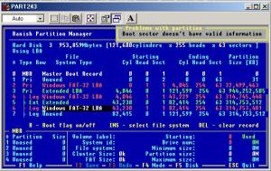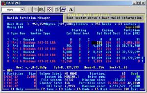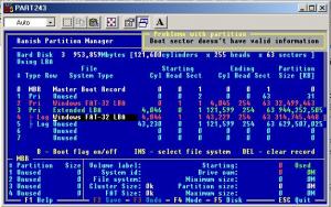 RPM looked the same - the changes aren't there. PL only showed the 1st Partition - 953,869Mb, 121601 cyls, 255 Heads, 63 secs/cyl, 512 bytes/sec # partition file syst. cyl. size(Mb) 1 FAT32 (LBA) fat 0 - 4045 31,737 primary/active empty space 4046 - 121,600 922,129 Windows gave it 1 drive letter @ 31.2 GB ________________________________________ If RPM isn't "taking" - could I not just take the beg & ending cyl #'s as shown in the RPM screenshot above & input them into PL & see if they "take" w/ PL?
