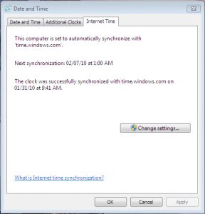 Check to make sure you don't have any viruses. Then open a command prompt window and run SFC /SCANNOW. Reboot. Go to Computer in the Start Menu and right click - select Manage - select Services and Application - select Services Scroll to Windows Time and set it to Automatic. Go to your clock in the system tray and right click select - Adjust date/time You should see a window that looks like the attached
