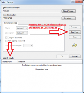 Hi, I just discovered the following error in windows management console, while editing users group memberships OR creating new users and trying to make them 'POWER GROUP' members. In either case the list of items doesnt get displayed at all. I have tried very hard looking for solution but couldnt find it anywhere. The only way to create user is by using the control panel and making it either STANDARD OR ADMINISTRATOR. --------------------------- Local Users and Groups --------------------------- The following error occurred while attempting to add the new user test1 to the Users group. However, the User was successfully created. Unspecified error --------------------------- OK --------------------------- I have attached my session as well, kindly have a look at this problem. Lastsession2 - Win7.2x3.3.inf Thakns in advance. -
