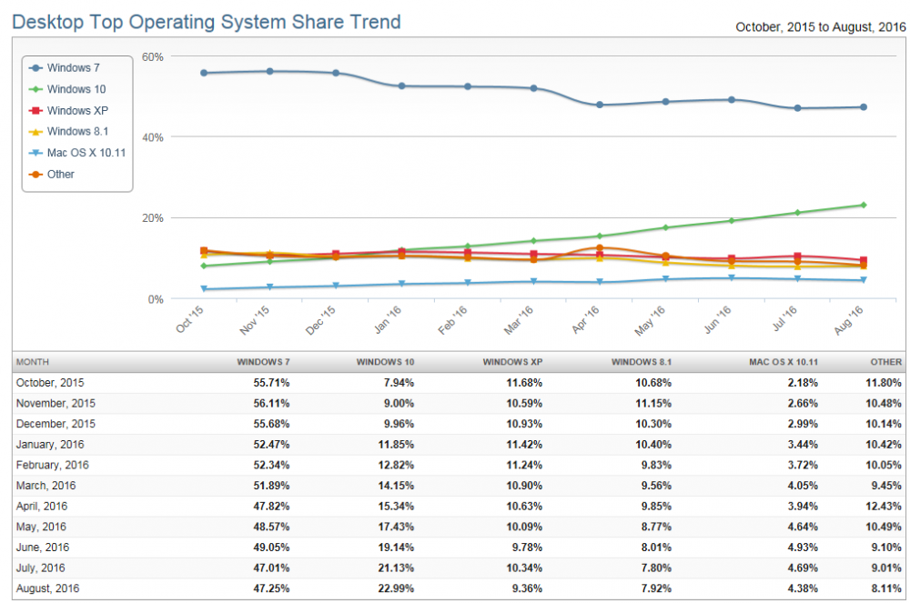That's very interesting, thanks! One trend that stands out for me is that Win7 and Win10 usage seem to have stabilized since the end of July: http://gs.statcounter.com/#desktop-os-ww-daily-20160512-20160910 Curiously, if you go to that page and hover the mouse pointer over the graphs, the Win10 and Win7 lines both flatten out almost completely right around the July 29-August 2 period when the "free" updowngrade offer expired and the Anniversary Update became available. --JorgeA