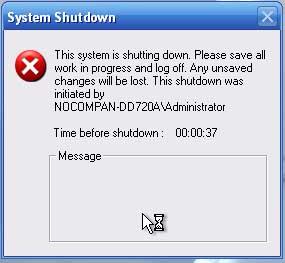 here is the error screen. how do i get rid of it? i did change the delay to 60 seconds. but the error screen still comes up. notice that the 60 seconds is in the error screen. maybe if i set no delay??? i just want the system to restart after completion of RunOnceEx.cmd cmdow @ /HID @echo off FOR %%i IN (D E F G H I J K L M N O P Q R S T U V W X Y Z) DO IF EXIST %%i:\CD.txt SET CDROM=%%i: SET KEY=HKLM\SOFTWARE\Microsoft\Windows\CurrentVersion\RunOnceEx REG ADD %KEY% /V TITLE /D "Final Modifications" /f REG ADD %KEY%\005 /VE /D "Installing Microsoft Office 2003" /f REG ADD %KEY%\005 /V 1 /D "%CDROM%\Software\Office2003\Office2003.exe" /f REG ADD %KEY%\010 /VE /D "Importing Registry Tweaks" /f REG ADD %KEY%\010 /V 1 /D "REGEDIT /S %CDROM%\Software\regtweaks.reg" /f REG ADD %KEY%\015 /VE /D "Finalise & Reboot Computer" /f REG ADD %KEY%\015 /V 1 /D "shutdown.exe -r -f -t 60" /f EXIT -