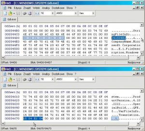 21. Looking at the different language versions SP2 and SP3 (other than "EN-US"), I met 16-bit files of type "NE" (e.g.: Krnl386.exe and Gdi.exe) that were in the revised language version, but information in the file description said that it is a version of "English". I suspect that these files were modified using eXeScope – a program which does not allow editing this information. Looking at these files in hex-editor, I noticed a certain regularity: block of information about a file ends of the word "Translation". At some distance it is followed by two adjacent groups of hexadecimal values, which are mirror image of the sequence values of ASCII, defining of the language, contained in initial part of the file information block. And so, for example: when the version of "EN-US" will have sequence consecutive ASCII codes: 040904E4 in the initial part of the block of information, the corresponding sequence hex values will be: 09 04 E4 04 (at the end in the file information block). Translation of the file to the “Polish” language version entails changing the sequence ASCII values to: 041504E2 - for which the correct hex values sequence will be: 15 04 E2 04 (at the end in the file information block). “English” language version: “Polish” language version: Correcting this way the "NE" file (with the resources previously translated into the desired language using eXeScope program) in the hexadecimal editor – is the unique correcting carried out in a hex-editor. It seems not to affect the correct structure of the file, but enters the correct information about the language of this file. The files: Gdi.exe and Krnl386.exe modified in this way, served me for several weeks, without introducing noticeable errors in functioning of my Windows 98SE system. If there is something wrong with my argumentation above, please correct me. egrabrych