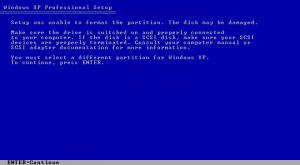 Hi Guys.... I am trying to create a personalized Windows XP SP3 for myself. I have done most of the job so i converted it to an ISO using nLite for some testing in Virtualbox. Now, during the Text Mode setup I encounter this error when i try to format a drive.(i have attached the screenshot too) --------- "Setup was unable to format the partition. The disk may be damaged. Make sure the driver is switched on and properly connected to your  computer. You must select a different partition for Windows XP." --------- I have tried another Virtual Partitions too but same problem. I also deleted the partition and created it again but it shows the same error when i try to format it. I thought that it was a problem with Virtual Box so i created a CD  of my XP and tried to install it on my Harddisk itself but all in vain. I am sure that my harddisk is not corrupt as one of my older SP2 CD  formatted it with ease and it got installed too. All in all i have tried everything that i know of computers but am not able to work it out. So, please help me guys.......ASAP