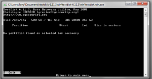 On the drive? Remember that this is VERY risky! Point is how you got there. Check this step-by-step as reference: http://www.cgsecurity.org/wiki/TestDisk_Step_By_Step If the drive was originally partioned under Vista or 7, in Options (4th screen) set: Cylinder boundary: No Allow partial last cylinder: Yes When testdisk asks if you want to search for partitions created under Vista reply Yes. Then when you get to that screen you posted, select Continue and do a "Deeper search". If you could state HOW the drive was previously partitioned (like how many partitions, which type, which filesystems, etc.) and under WHICH operating system ( Linux, 2K/XP, Vista , 7, etc.) it would be a plus, as it is likely that we can find the actual bootsectors manually.... jaclaz Drive was formatted under Windows XP - NTFS - its always been a secondary drive. I hit no at the Vista screen - Whats my next step? My lack of reading your response (hitting continue to do a deeper search now)