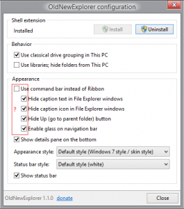 This might be an interface bug with O-N-E itself? Seems that you can actually check all the sub-options below "Use command bar instead of Ribbon" without having that parent option checked: In that case most of the sub-options will actually take effect (!?) But a "Ribboned" window will not show the "glass on navigation bar", even with "Minimize the Ribbon" enabled (most likely because the Ribbon object is preventing that from happening). Note in this screenshot that the other sub-options (Hide caption text, Hide caption icon, etc.) are still in effect: Personally I prefer the flexibility of the other "sub-options" actually working independently of the Ribbon being enabled or disabled. I would like to see all of those options un-indented in the config GUI to indicate this fact. But (based on what I understand about how the Ribbon affects Glass) I believe that the "Enable glass on navigation bar" needs to remain a sub-option of "Use command bar instead of Ribbon" and needs to be unchecked and grayed out when the parent option is not enabled. (Edited to correct that last sentence! ) More on the effects of the Ribbon on Glass and blur here: http://www.msfn.org/board/topic/170850-aero-glass-for-win81-131/?p=1090261 ... and here: http://www.msfn.org/board/topic/170850-aero-glass-for-win81-131/?p=1090263