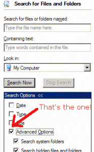 I've been wading through endless pages of tweaks hunting for one particular setting that eludes me. I fear it's not something that can easily be solved.. but here goes. In the XP classic search, I'd like to know how to have the "Advanced Options" checkbox always checked. I find the search feature relatively useless without that. And I get quite sick of forgetting to check it. My default advanced options have been set, thanks to other regtweaks, but I can't figure this one out for the life of me (even using RegShot didn't seem to be of use). If you are wondering what I mean, check the image (in case there are others pulling all-nighters) Any ideas?