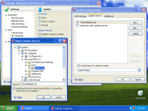 4. Sonic, I read through this thread and I have 303en doing a silent install without rebooting by applying the 'LastStart' entry to the reg. I would like someway to automate the first update which currently requires another reboot to be functional. I'm not concerned about the next reboot, but I would like to automate getting the initial update as it is currently approximately 8MB. My first attempt has been a failure so far. I pulled the Bases directory from C:\Documents and Settings\All Users\Application Data\Kaspersky Lab\AVP6\Bases\ and zipped it up. On a second system with a fresh KAV6 install, I copied the Bases.zip file over and modified the Update Servers. I unchecked the Kaspersky Lab's update servers and added the path to the zipped version of the Bases directory from the other system (see attached image). This works, so I attempted to script my solution by using the following registry entry before running the update: Windows Registry Editor Version 5.00 [HKEY_LOCAL_MACHINE\SOFTWARE\KasperskyLab\AVP6\profiles\Updater\settings\Sources\0000] "Enable"=dword:00000001 "Plain"=dword:00000001 "Path"="C:\\Documents and Settings\\Administrator\\Desktop\\Bases.zip" [HKEY_LOCAL_MACHINE\SOFTWARE\KasperskyLab\AVP6\profiles\Updater\settings] "UseInternalSources"=dword:00000000 After applying the registry entry above, I use 'avp UPDATE' from the command prompt. This worked too, as it applied all the updates from the zipped file. The problem is getting the registry back to normal afterwards without manual intervention. Windows Registry Editor Version 5.00 [HKEY_LOCAL_MACHINE\SOFTWARE\KasperskyLab\AVP6\profiles\Updater\settings\Sources] [HKEY_LOCAL_MACHINE\SOFTWARE\KasperskyLab\AVP6\profiles\Updater\settings] "UseInternalSources"=dword:00000001 Once KAV6 has been installed and updated, attempts to modify the registry return 'access denied'. Any ideas how to get around this and get the system back to normal, or perhaps an entirely different approach?