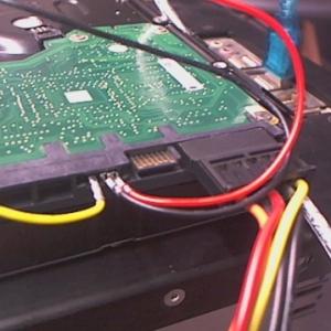 1. thanks for the help, here is a new pic of my setup blue wire tx > rx yellow wire rx > tx black (on hdd) gnd to gnd connected with the red wire psu gnd the power supply comes from a usb, when i try to gnd the - of the power supply i get the weird characters error else i don't get anything. thanks, dimitris