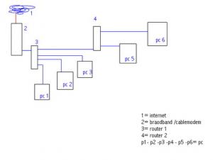 hello to all Iám trying to expand my network but it is not working like it has to. i got ( at my place we are 3 persons and 5 pc ) 2 pc for me and the other are of my parents. i hade made a network whit 4 pc 1 for me worked great now i like to add 1 extra pc for me . i brougt a extra router and made this configuration. but is not working good on pc1 pc2 pc3 pc5 pc6 i got internet super on the network of pc1 i see pc1 pc2 pc3 no pc5 no pc6 on the network of pc2 i see pc1 pc2 pc3 no pc5 no pc6 on the network of pc3 i see pc1 pc2 pc3 no pc5 no pc6 on network of pc5 i see pc5 pc6 no pc1 pc2 pc3 on network of pc5 i see pc5 pc6 no pc1 pc2 pc3 what is wrong is the 2e router the problem is there a way to fix this hope to be clear sorry for my english . Thanks in advance Scorp