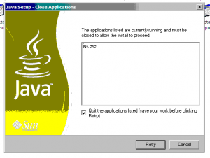 Hello, I received the attached message when trying to silently install Java 6 Update 29. The message pops up on machines with internet explorer opened, or java is being used by another applications. Can someone please tell me where I went wrong, and what I can change in order to make my install more silent. Is IEXPLORER=1 needed? The machines I am updating are all running Windows XP 32 bit. I ran the following: echo off start C:\support\jre-6u29-windows-i586-s.exe /s IEXPLORER=1 REBOOT=SUPRESS JAVAUPDATE=0 SYSTRAY=0 >c:\support\it\install_java.log
