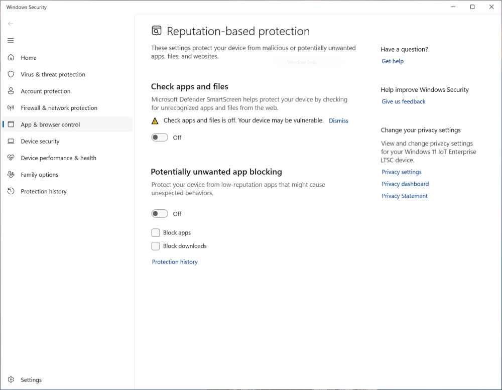 The MDL user I mentioned did some more research. Sorry for the dirty cut-and-pase, but my previously edited message disappeared when I tried to post it here: (My question was: "What is 'reputation based protection'?") Quote: Smartscreen. I try to disable it but it doesn't want to. https://i.imgur.com/kLnERuZ.mp4 I also tried to disable it from registry and policy editor but it was still enabled. Probably happens only on IoT version. Edit: I did some tests. It happens on both IoT and non IoT version of LTSC 2024. When I don't disable Defender with WinNTSetup I can disable Smartscreen. I tested to disable Defender with a script from TairikuOkami "Microsoft Defender Disable.bat" https://github.com/TairikuOokami/Windows (Windows Defender quarantines the script so disable tamper and real time protection first) and both Defender and Smartscreen was disabled after using the script. So it is the way WinNTSetup disables Defender that is the problem. You can contact the dev and report it. Thanks