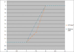The smoothing that happens just near a step point is subtle, and I argue better (a little) in XP/Vista/7 than it was in Windows 2000... I presume you have tried one or more of the × 1.0 stepping up to × 2.0 curves, and saw MouseMovementRecorder show what looks like a single intermediate smoothed value, rather than a sudden step-up? MMR might show 8 as 1:1=8, then 9 as 1.5:1=13, then another 9 as 2:1=18, and then other values at 2:1. The middle 9 = 13 or 14 looks like "smoothing", which didn't happen in Windows 2000, and therefore bad? Not necessarily so... (If instead you were using a 1:2:4 curve, where the middle 2:1 section was a slope increasing from 1:1 to 4:1, then what I say below WON'T apply, but if you were using a 1->2 curve, please keep reading... (For the examples below, forget the REG curve that steps up at 9, and imagine one built to step-up at exactly the same point that Windows 2000 did: 8) 1) If you are sweeping up past the threshold and then stay faster 8 or faster, then the difference is only 4 pixels that occurs once only (as the threshhold is passed) and likely not felt or noticed. 2) Imagine instead you are moving the mouse at a constant speed (perhaps trying to track a target?) Suppose that speeds happens to be right at the threshhold, right in the middle, and you are moving at (on average) 7.5 mouse counts per poll. The mouse sends 7, 8, 7, 8, 7, 8, ... Windows 2000 would apply 1:1 to each of the 7s and 2:1 to each of the 8s, so after accel, the pointer would be 7, 16, 7, 16, 7, 16... So a mouse speed of 7.5 has pointer speed of (7+16)/2 = 11.5 pixels on average. Average gain is 11.5/7.5 = 1.5333 ! Even Windows 2000 has smoothing just either side of the step-up point. I've built a graph showing the difference between W2K and XP/Vista/7 for a mouse moving at a constant speed: (X axis is (average) mouse movement in counts, Y Axis is (average) scaling applied) Notice the transition between 7 and 8 is steeper with XP/Vista/7 than it is for Windows 2000. As Windows XP/Vista/7 processes the 8s, it notices that IMMEDIATELY BEFORE the 8 was a 7, which was in the previous curve segment. It reduces the accel to an average of the two curve segments, 1.5:1 for each 8. As Windows XP/Vista/7 processes the 7s, it notices that BEFORE the 7 was an 8, which is in the next (or same) curve segment, and it does nothing special, just uses the current curve 1:1. So after accel, the pointer would be 7, 12, 7, 12... and the pointer speed is (7+12)/2 = 9.5. Average gain is 9.5/7.5 = 1.267 ! The middle of the step is pulled down, making the transition steeper. I think the steeper transition is better than the shallower transition. 3) Windows XP/Vista/7, the transition steepening can't be turned off, so there is no choice but to accept it! You can't change your mind now! I've just gone and applied much magic, and I now have 3 part curves where NO part needs to be a compromise. There is a flat 1:1 section, a step up, a flat 2:1 section, a step up, a flat 4:1 section. (These curves will closely match the Windows 2000 Medium and High accel settings.) (They do have the "smoothing"/"transition steepening" as described above.) When you used Windows 2000, did you use Low accel, or did you use Medium or High? If you used Medium or High, would you like to try one of my "magic" curves? -