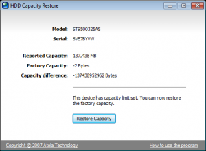 Yep, that's the tricky part. See what the Atola tool has to say, first thing (remember that it is just a "semi-random guess" that the drive self-capped ). http://blog.atola.com/restoring-factory-hard-drive-capacity/ whether tool will work under 7 and particularly under 7 x64 is up to you to find out. jaclaz OK, so I managed to make the Atola tool work (had to try on a 32-bit version of Windows 7). Things seem to be getting trickier by the minute... -