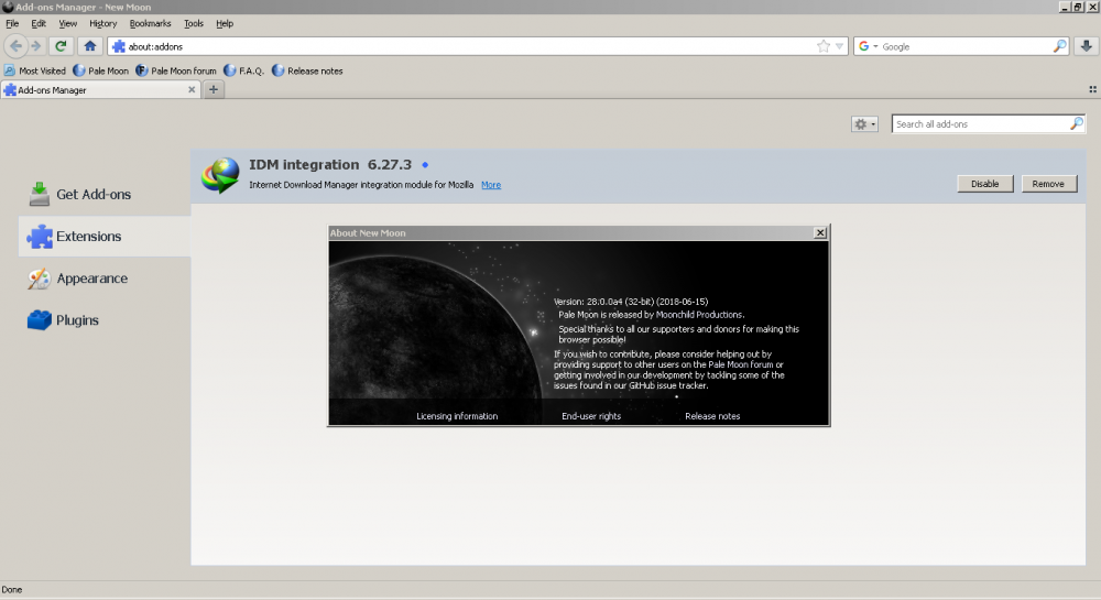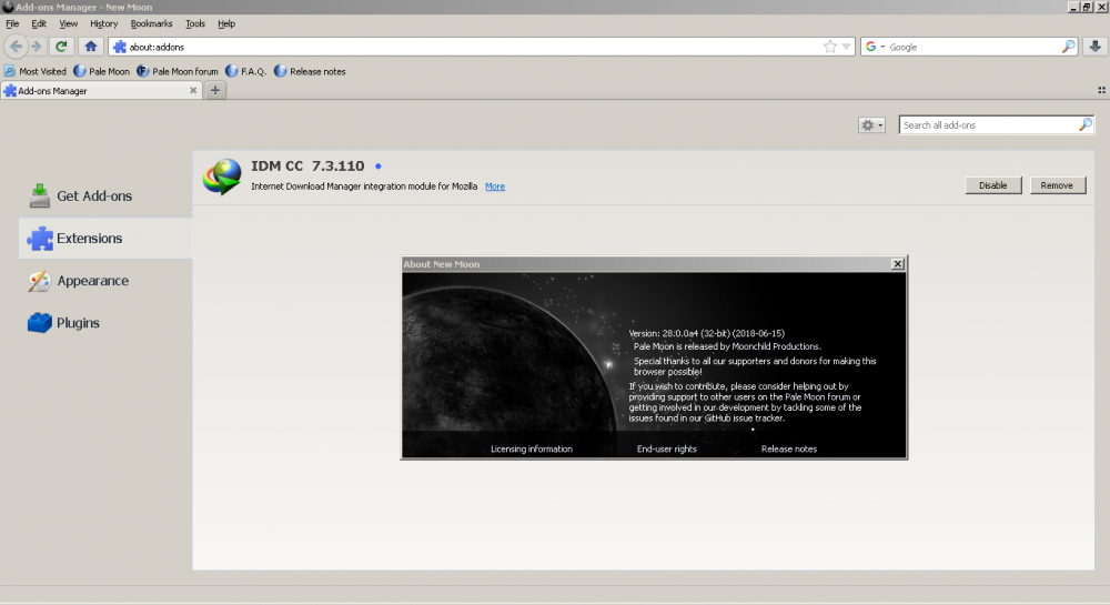 @VistaLover Inactive, although installed. It only works with New Moon (Pea Moon) version 27. New Moon 28 can work well on a site that New Moon 27 inoperable I do not require the installation of IDMCC, but there may be an alternative to IDMCC in New Moon 28. Another extension or function equivalent to IDMCC idmmzcc.xpi - not work idmmzcc2.xpi - not work -