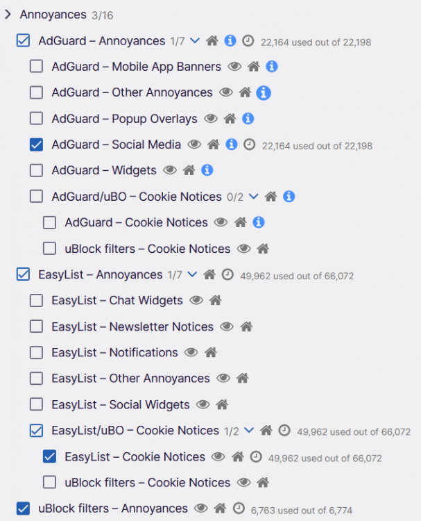 It's been some time that both Annoyances lists (AdGuard/EasyList) have been split into sub-categories. It'd be great if you could bring this to the Legacy version! These lists are often involved in website breakage, and having sub-categories would make it easier to enable/disable unwanted stuff. Of course, I don't know if these newer sub-categories are fully compatible with Legacy. I'd expect them to, since the "main" Annoyances list I assume is the sum of all smaller sub-categories. (I've seen references to an "Annoyances bug" in older posts, but I'm not sure what that was/is.)