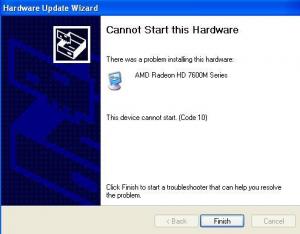 Hello, Already done. No effect (only the name changed). Done, but no effect. To be sure, I uninstalled drivers for AMD (the driver dissapeared from device manager), and run the executable - the catalyst (without restart between these actions). Anything new in Device manager after running the executable - see capture 2. After reboot, automaticaly the system recognise the AMD Radeon HD 7600 M Series (see capture 1), with the yellow mark. I unzipped the package with 7zip, and tried also to update the driver directly with Have Disk, pointing to the 4 *.inf files found in the package, one by one. I received every time the same message: "The specified location does not contain information about your hardware." see capture 3 Gabriel