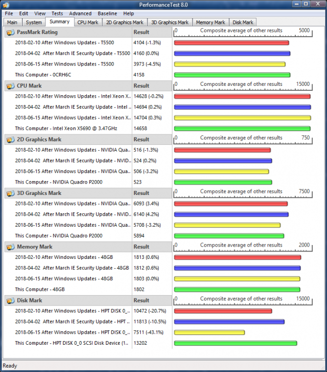 Besides using it for strenuous parts of my work continuously since 2012, I've done regular benchmarks on my current workstation after ANY change of software since it was running Windows 7. In October 2013 I upgraded it to Windows 8.1. Even though I know how to keep a Windows system working at tip-top performance, and even optimize it over time, there has been a decline in performance of the operating system on this hardware. The best performance overall, both in benchmarks and in real work, I experienced in 2013 before upgrading it to Windows 8.1. The overall hit to performance to move to Windows 8.1 was only a few percent overall, but it was noticeable. Since then I've upgraded the monitors and graphics card, having put a more powerful workstation card in it about a year ago. I've added some SSDs as data disks but they don't participate in the benchmarks. What have I seen? I have measured performance changes specifically seen in these discrete places: * In late 2013 I lost about 5% overall performance when Win 8.1 replaced Win 7. * Direct2D took a serious discrete performance hit that affected benchmarks overall but not really the real work I do back at the end of 2014. * I gained back some display performance, which boosted overall benchmark numbers a little, when I installed a new graphics card in mid 2017. * I saw an overall 5%+ overall performance loss with the June 2018 cumulative update with Spectre and Meltdown mitigations DISABLED, which I was able to undo (and regain performance) by uninstalling the update. The important thing about these losses is that they were in disk I/O and display performance, which really do affect real work. In summary: Comparing overall performance numbers from late 2013 running Windows 7 to the June 2018 Windows Update of Windows 8.1, and accounting for an approximately 4% overall score boost due to the new graphics card, I'd say performance is down today from when I first started carefully measuring this hardware's capability by about 15%, and this does not include the MAJOR performance hit due to Spectre and Meltdown mitigations when they are enabled. The difference, at this level, of the price of machines that can do X and 15% more than X is not insignificant. Add another 20% to 30% loss in performance if you DO want the Spectre and Meltdown mitigations. What price security? Don't let fear of the unknown blind you to the degradation of the operating system being systematically done by Microsoft. -Noel