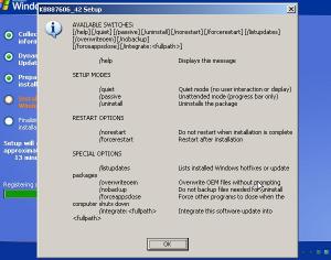 Let me start by showing the screenshot of the problem According to the XPcreate.log : Renaming msxml4sp2-kb887606-x86-enu.exe to XPCTF108.exe Now here is whats in my svcpack.inf for that hotfix after XPcreate is finish: "XPCTF108.EXE /Q:A /R:N /C:""DAHOTFIX.EXE /Q /N""" I tried changing to: "XPCTF108.EXE /Q:A /R:N /C:""DAHOTFIX.EXE /Quiet /Passive /Nobackup /NoRestart /overwriteoem""" but it still comes up. How can i fix it??