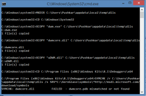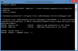 The first time I ran the symbols.cmd file in an Admin command prompt, I got: SYMCHK: dwmcore.dll FAILED - dwmcore.pdb mismatched or not found I changed the symbols.cmd file to run symcheck with verbose output (add "/v" option, i.e. SYMCHK /r /v), and ran symbols.cmd again and that second time I ran it, it worked (though it had nothing to do with the change I made to that file). SYMCHK: FAILED files = 0SYMCHK: PASSED + IGNORED files = 3 I Added /v parameter but still same result after 15 tries