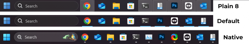 1. Not exactly. The taskbar is markedly different. Plain8 uses the Windows 8 active icon styling with the windows 8 jump lists. Default should be renamed to 10 as that's the styling it's using but the jumplists are a hybrid of "default" and "native". There's no setting to employ the Windows 10 style jump lists and their translucency. Plain8 in the old StartIsBack on Windows 10 used the native Windows 10 jumplists. Is there not some way to offer jump list configurability? My dream mix is Plain8 taskbar with default/native style jumplists (only if Windows 10 jumplists are not possible). Happy to donate to try make this possible.