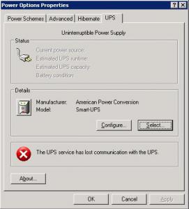 I have an APC Smart-UPS 1400XL connected to a server running Server 2003 through a serial cable. When I go to the Power Options under the UPS tab i have an error that states "The UPS service has lost communication with the UPS." I cannot figure out how to resolve this issue. I have tried two serial cables from APC (490-1524c and 490-0020b) with the same results. Any help will be greatly appreciated. Thank You.