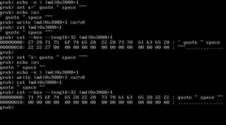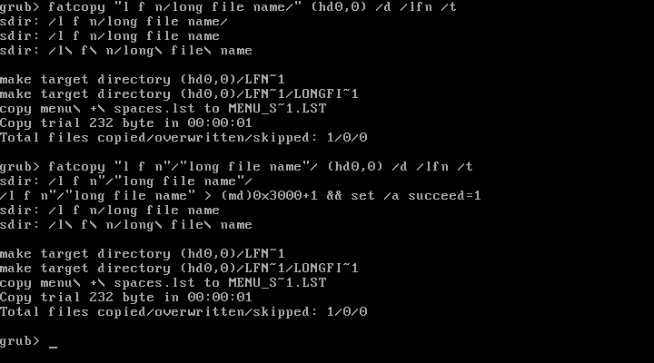 8. I solved my problem using quotes & spaces on the FATCOPY.G4B command-line. It appears that outside-quotes are removed if %~d1 / %~p1 / %~nx1 are used to read out DEVICE1 / PATH1 / FILE1 etcetera. So different from GRUB4DOS commands like ls, where a quote-sign before a DEVICE gives an error. To avoid undesirable results because of remaing spaces in variables, all I had to do was an earlier call to my subroutine that changes normal spaces the the GRUB4DOS "\ "-spaces representation. If quotes are used around PATH and /or FILE (or -superflous- even around DEVICE) things became more complicated if only one quote-sign is left after the readout (or three). It appears that a variable containing an odd number of quotes, regardless their position inside the variable, can not be written into memory with echo %var% > (md)0xMMMM+1. In this case the whole command-line is echo'd on screen, nothing happens further. I found a sort of workaround to add one quote-sign to the variable if this happens, but I am not fully satisfied, because the workaround in fact doesn't detect an odd number of quotes in the variable, only that writing a variable to (md) didn't happen. Also quotes can't be detected by %var:~s,n% , although they are counted by echo %@retval% after set var=%var% Any ideas?