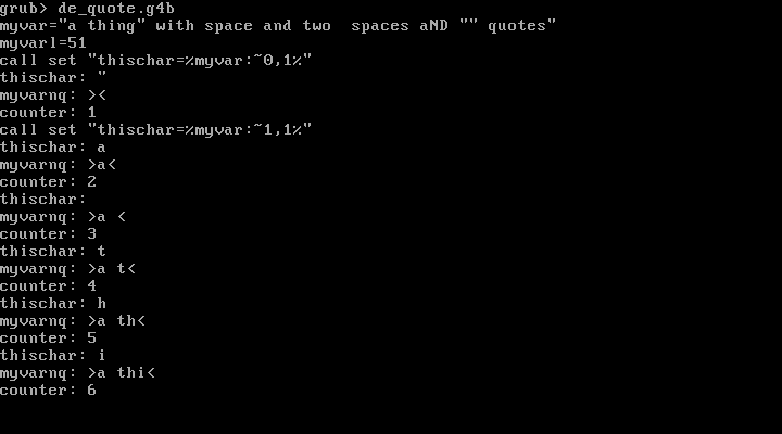 4. @jaclaz Thanks a lot I am VERY happy to have a working example with call expanding %^var:~s,n% with a loop! I've red everything about it in Steve's documents I could find, but still didn't grasp the whole 'thing'. In my understanding of your batch-file the double-quote character " can be evaluated with if %var%== if between two 'supported' characters. I believe the colon you included in set thischar=%^myvar:%counter%,1%: is needed because of the spaces. But I found out the colon can be left outside if double-qoutes are used during setting thischar, then if not \%thischar%:==\" : is always working (and will the line if ":"=="%thischar:~0,1%" set myvarnq=%myvarnq:~0,-1% be unnecessary). To fit in one print-screen I changed 'something' in myvar too. Also substituting spaces with the needed ls-spaces ("\ ") is easygoing with your approach expanding variables with call. But I think your idea to use write to get even a variable containing an odd number of double-quotes into (md), together with my use of dd will be a bit faster. Only a fistful of spaces need to be cut out, instead rewriting the whole variable. Or am I wrong?