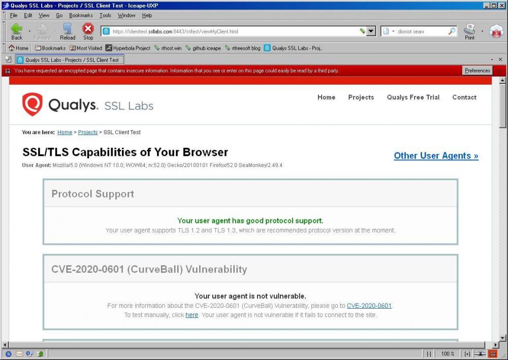 You're right, I never saw the forum software do that before... link is fixed. Here are screenshots for the linked sites. Lest you assume it is some sort of network blockage or firewall issue - no, it is able to visit the Qualys site, it seems to report TLS1.3 being available as expected. While these screenshots are being made with iceape default profile that has no addons, I get the same results in my seamonkey install with its usual addons, which in time past used to be able to visit github until fairly recently. I even tried installing JustOff's polyfill addon (since I use it on my W7 system running 2.53.19) but that makes no difference on the XP system, not sure if it can really work in Seamonkey 2.49 even after installing, but it does not help either seamonkey 2.49 nor iceape. What I find odd is that iceape supposedly has TLS1.3 available where seamonkey 2.49 does not, yet that seems to make no difference in what sites the browsers can connect to.