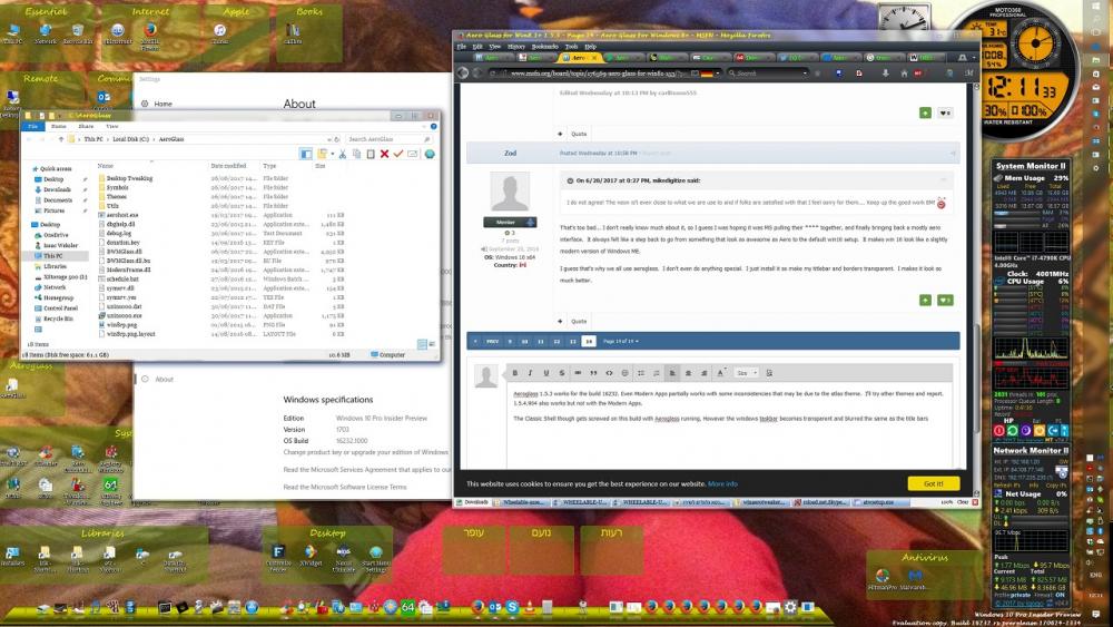 Aeroglass 1.5.3 works for the build 16232. Even Modern Apps partially works with some inconsistencies that may be due to the atlas theme. I'll try other themes and report. 1.5.4.904 also works but not with the Modern Apps. The Classic Shell though gets screwed on this build with Aeroglass running. However, the windows taskbar becomes transparent and blurred the same as the title bars.