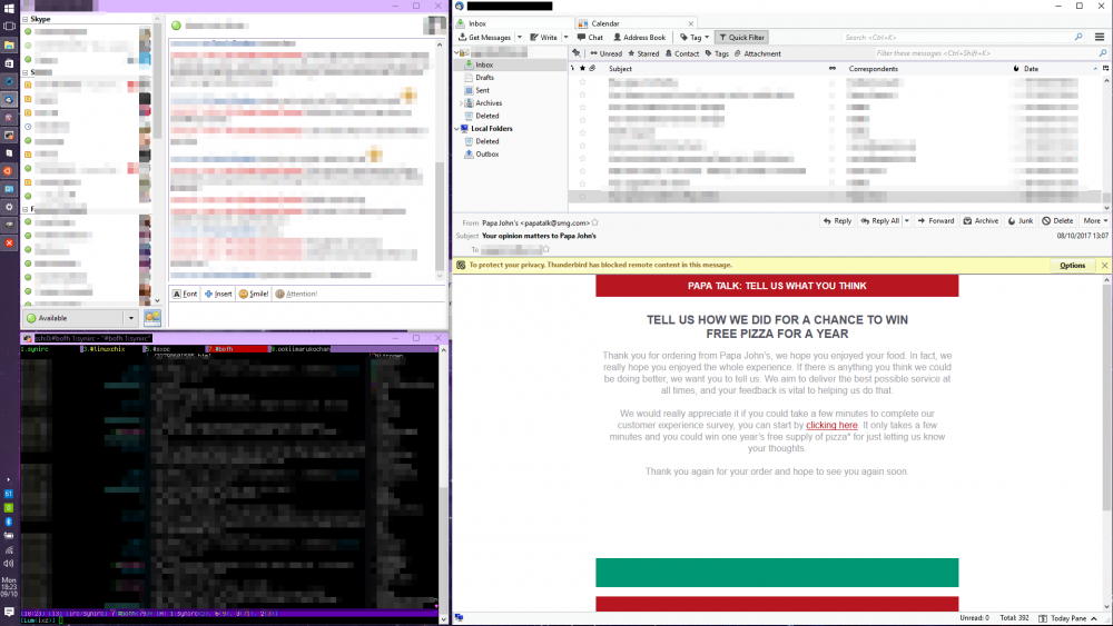 Stock Win10 theme No theme atlas 7+ taskbar tweaker to narrow the vertical taskbar to 32p Secondary taskbars provided by displayfusion. Optimus hybrid graphics setup where internal display and right hand monitor are driven off the Intel HD530 and the left hand monitor is driven off the nVidia 960M. Glitch only occurs on the right hand monitor, and tends to be more prominent if the adjacent window is doing hardware scrolling. GlassMyFox and GlassMyBird installed for Firefox and Thunderbird respectively.
