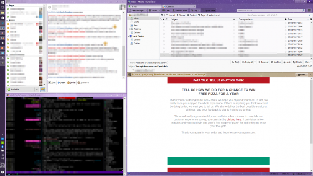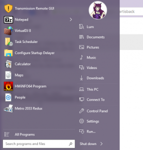 Not massively in your face bling. My setup is based around keeping the OS and toolbars useful and informative, but also small and out of the way. I also quite like purple. Aero7 Square theme 7+ Taskbar Tweaker with the no-width limit setting enabled to make the taskbar only 34px wide TClock Redux to get the date back after making the clock really small Win 8.1 start orb recoloured to go light purple instead of blue when hovered. Default Win8rp.png atlas re-coloured to purple. TXMouse for Linux-like focus follows mouse that doesn't suck MoveToDesktop for the handy titlebar menu HWiNFO64 for the CPU temperature (GPU temperature appears above the CPU temp in nVidia green when Optimus kicks in) Firefox is using TreeTab as it has the ability to remove the titlebar when maximised, and classic theme restorer for AeroGlass on the navbar, small icons, coloured icons etc. Background was just a Google image search for "purple aurora", not sure who took it sorry! Glass8, StartIsBack++, OldNewExplorer and Minibin, the usual! Command prompt font is TerminusTTF, I also use it for PuTTY and Bash as it contains the PowerLine glyphs And a custom AutoHotKey script that launches 2 virtual desktops filled with my startup apps, and keeps the entire thing hidden behind the wallpaper image and a progressbar rather than making you watch windows popping up and getting shuffled about and multiple desktop changes. For some reason Cortana got re-enabled while I was taking the pics, that's normally removed. Also DoubleSAnimations your Aero Retro theme is beautiful, is there any chance you could port it to Win10 RS2? I'd love to use it. -