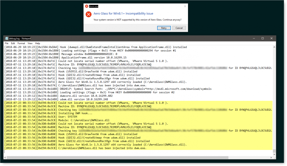 I'm having an issue with the latest Win8.1 update. After the update is done it breaks Aeroglass. Fortunately this is a VM and it's always snapshoted before any update, so I could rollback those updates. I don't know what update broke the thing, I have on the queue KB4099635, KB4284815, KB4287903 and KB8900830. These are basically monthly rollups and the last one is the Windows Malicious Software removal Tool. This Windows is version 6.3.9600 and Aeroglass is version 1.4.6. I tried v1.5.3 and v1.5.8 but a message is displayed saying it's not intended for my Windows. If I reinstall V1.4.6 after Windows Update to try to fix it, it doesn't accept my licence anymore.