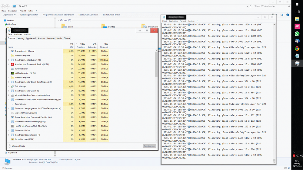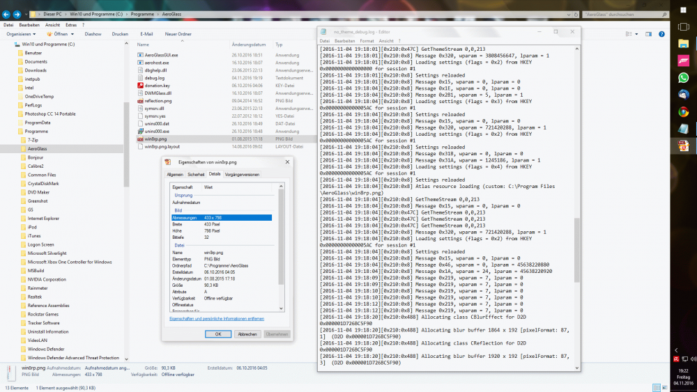 Hello Bigmuscle and fellow Glass8 users! I run Windows 10 mit Glass8 on my Desktop PC, and since the anniversary update I have to randomly recurring problems with Glass8. 1. White window borders Normally, all is working fie, but on some windows starts I get white window borders instead of glassy ones. See attached screenshot. debug.log shows nothing out of the ordinary as far as I can tell. when this happens, DWM seems to run into some kind of memory leak as it grabs more and more RAM for itself. Normally it uses about 17-20MB, as you can see in the screenshot, I had already over 300MB allocated after maybe 15 minutes. I then restart windows and the issue is gone, glass is back and DWM runs normal. 2. Glass8 theme not applied This also happens randomly and more often than the first issue. According to the debug.log the standard theme (which I am using) is loaded, but the window border is just glass without a theme. I can either restart Windows or just apply the theme again using the GUI. Then the theme is loaded correctly. I tried the configure it using the GUI in admin mode, but that did not help. I also searched the registry with regedit related reg keys, as I have moved the install location. There was one key with the old path to the theme, which corresponded to a file not found error in the debug log where aerohost used the old path to the theme file. I have corrected this and the path is correct now, but the issue still randomly appears. Here it appeared directly after the reboot I did because of issue 1. Maybe someone has a clue or idea what could be the cause of this issues? I will gladly provide any information or logfile needed, just tell me what I have to do. Thanks! no_theme_debug.log white_windowframe_debug.zip