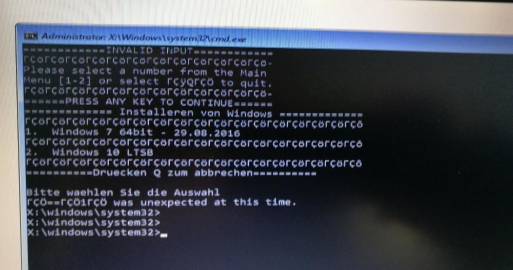 Ok, you fave right with redundancy/duplication/waste of storage. I have try change wim image in WinPE with menu: @ECHO OFF SETLOCAL ENABLEEXTENSIONS C: CD\ CLS :MENU ECHO ============= Installeren von Windows ============= ECHO ————————————————– ECHO 1. Windows 7 64bit - 29.08.2016 ECHO ————————————————– ECHO 2. Windows 10 LTSB ECHO ————————————————– ECHO ==========Drücken Q zum abbrechen========== ECHO. SET INPUT= SET /P INPUT=Bitte wählen Sie die Auswahl IF /I ‘%INPUT%’==’1’ GOTO Selection1 IF /I ‘%INPUT%’==’2’ GOTO Selection2 IF /I ‘%INPUT%’==’Q’ GOTO Quit CLS ECHO ============INVALID INPUT============ ECHO ————————————- ECHO Please select a number from the Main echo Menu [1-2] or select ‘Q’ to quit. ECHO ————————————- ECHO ======PRESS ANY KEY TO CONTINUE====== PAUSE > NUL GOTO MENU CLS :Selection1 SET wimdrive= FOR /F "tokens=1,2 " %%A in ('wmic logicaldisk get caption^,VolumeName 2^>NUL') do ( ECHO %%A %%B IF /I "%%B"=="wim" SET wimdrive=%%A ) IF DEFINED wimdrive ECHO Lauferk mit dem Namen "wim" wurde gefunden: %wimdrive% &&PAUSE&&GOTO :_doit ECHO wim-Laufwerk wird nicht erkannt :( PAUSE GOTO :EOF :_doit ECHO Jetzt wird alles automatich gemacht (diskpart, imagex(dism), bcdboot)! Diskpart /s %wimdrive%\mbr.txt %wimdrive%\Imagex.exe /apply %wimdrive%\win7_64bit_2016.wim 1 C: :Quit CLS C: CD Windows CD Syswow64 bcdboot C:\Windows /s S: ECHO Fertig. Bitte PC neu starten (exit befehl). :Selection2 SET wimdrive= FOR /F "tokens=1,2 " %%A in ('wmic logicaldisk get caption^,VolumeName 2^>NUL') do ( ECHO %%A %%B IF /I "%%B"=="wim" SET wimdrive=%%A ) IF DEFINED wimdrive ECHO Lauferk mit dem Namen "wim" wurde gefunden: %wimdrive% &&PAUSE&&GOTO :_doit ECHO wim-Laufwerk wird nicht erkannt :( PAUSE GOTO :EOF :_doit ECHO Jetzt wird alles automatich gemacht (diskpart, imagex(dism), bcdboot)! Diskpart /s %wimdrive%\gpt.txt dism /Apply-Image /ImageFile:%wimdrive%\win10.wim /Index:1 /ApplyDir:W:\ :Quit CLS C: CD Windows CD Syswow64 bcdboot W:\Windows /s S: /f ALL ECHO Fertig. Bitte PC neu starten (exit befehl). PAUSE :Quit CLS ECHO —————————————————- ECHO =============PRESS ANY KEY TO CONTINUE============== ECHO —————————————————- PAUSE EXIT But this is not working :(. Can you help me edit this script? Where I have made a mistake? Thank you!
