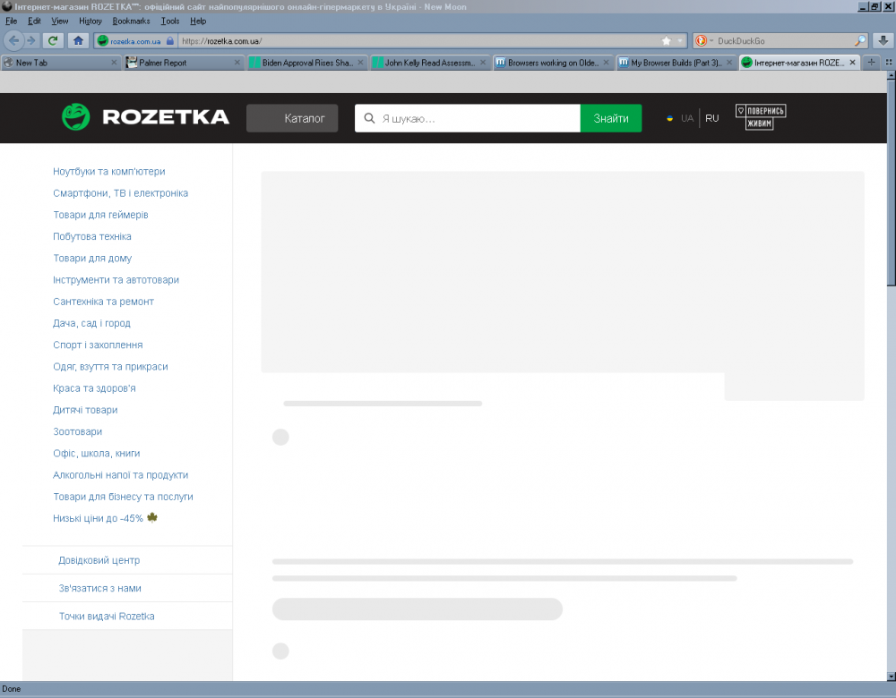 8. https://rozetka.com.ua/ Is completely unusable at this point with 2022-07-20 versions of New Moon and Serpent 52. Not even rendered basically. But old 360EE 11 show it right. Can anybody have any ideas? Should i complain on Pale Moon forum as PM also fail to show it right under Windows7 ?
