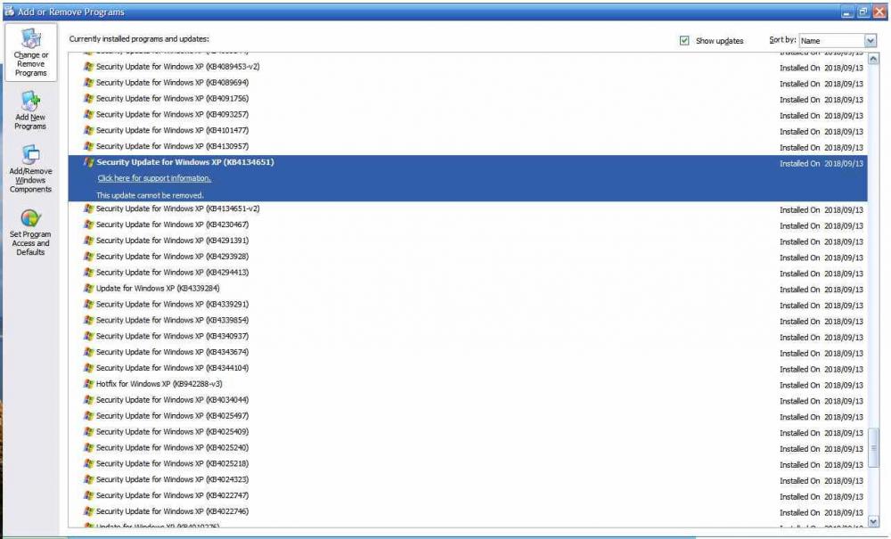 My XP is a very old installation (4 November 2005) and has been fiddled with a lot. Its nowhere near a clean install any more and has been patched a lot, imaged over a hundred times .... if you get the picture. It might even be some kind of record for XP. Could be that I installed those updates in one go using Ghosts update pack. I have only recently started using IE8 updates. I have no uninstall feature for the bad update file and heinoganda patch did not do the trick, he also said I need to uninstall the 2 KB4134651 updates first, which I cant. I need to uninstall the KB4134651-V2 file first, which I cant. Anyway, not a train smash, I can always restart the PC and scan from Windows 7 until MS comes out with a patch.