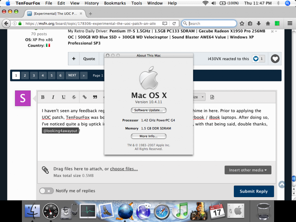 I haven't seen any feedback regarding testing on OSX PPC, so I figured I'd chime in here. Prior to applying the UOC patch, TenFourFox was borderline unusable, even on the fastest Powerbook / iBook laptops. After doing so, I've noticed quite a big uptick in performance, especially while scrolling! So, with that being said, double thanks, @looking4awayout!