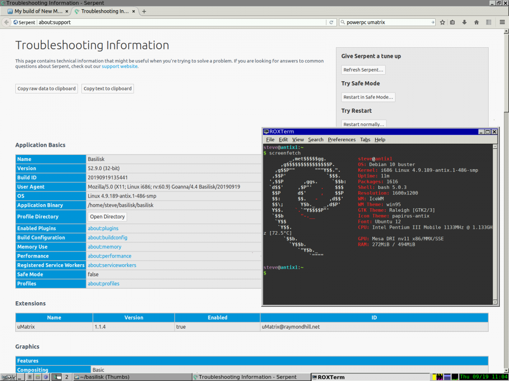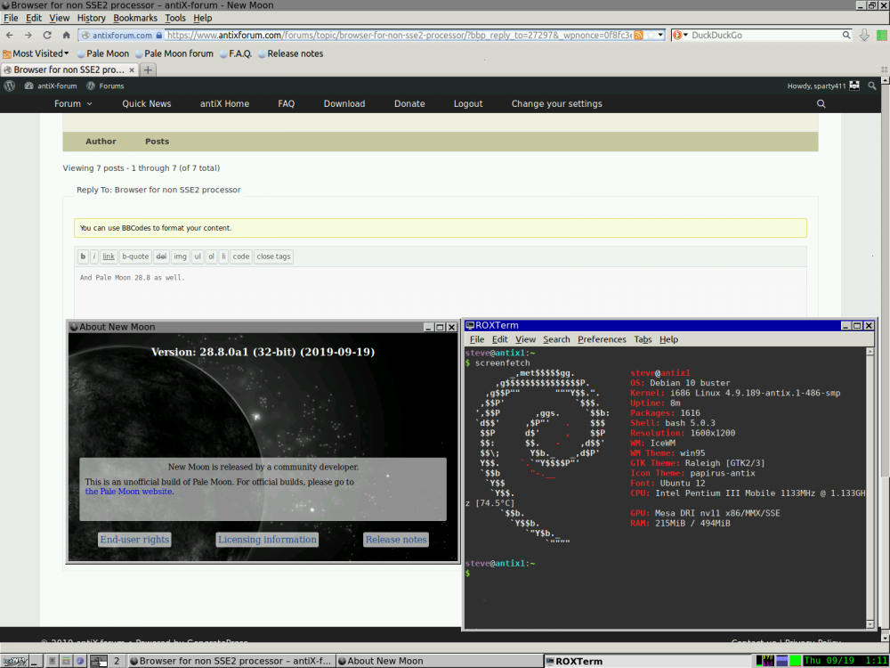 Good stuff! Firefox 45.9 ESR and Pale Moon 27 have been problematic as of late. I had to relegate the Athlon XP to Debian Sid, so I could compile UXP without SSE2 and get a usable browser. Looks like I may be moving back to XP now 👏 -