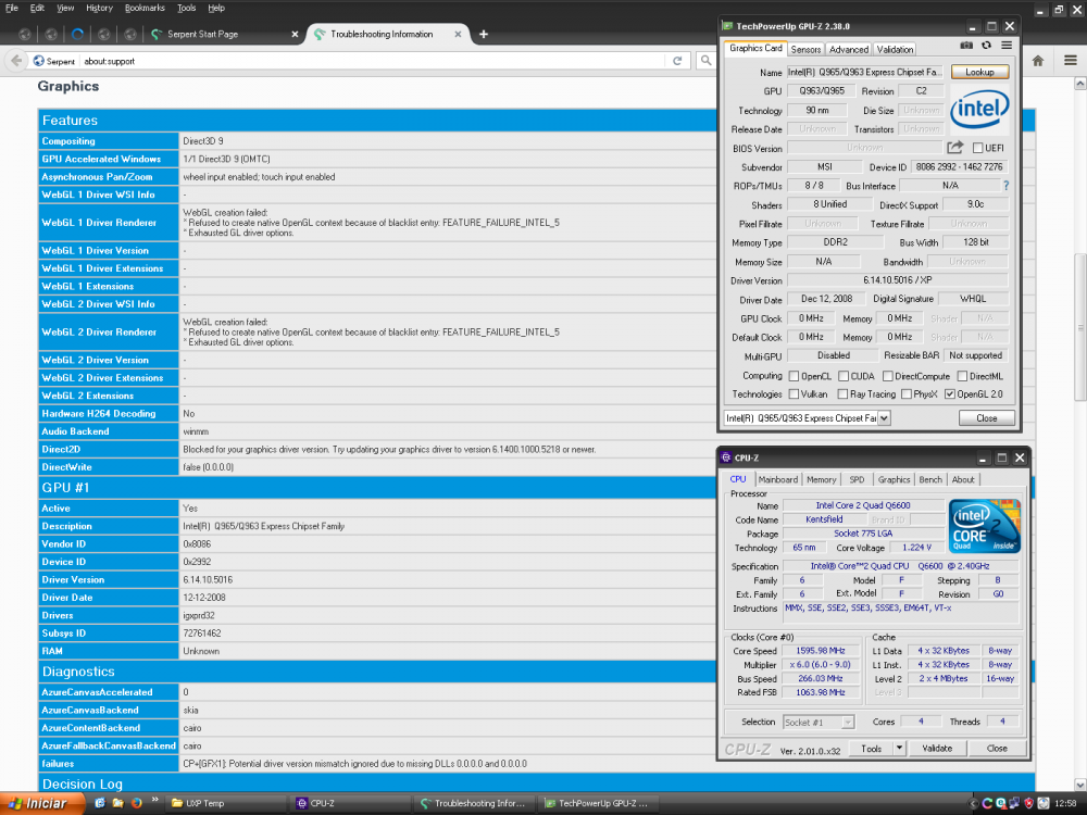 I tried to use the Insert image from URL post option, but the forum software rejects the links for some reason. Anyway, here are 2 pics, showing working layers acceleration on Windows XP Version 2002 SP3, and Windows 7 SP1 x64. Keep in mind that, for the GMA3000, layers acceleration needs to be force enabled, to get around the driver blacklist. -