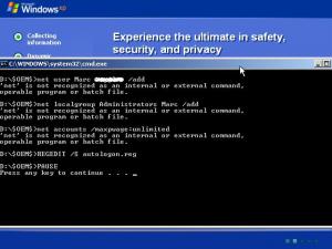Hiya everyone, Lately, everytime I've tried a new UA cd with improvements over my last everything has gone fine except for the fact that when I hit the logon screen after the installation, it waits for me to give the administrator password. The thing is however, I have my cmdlines.txt, useraccounts.cmd, and autologon.reg all made and ready in the OEM folders to create the user account Marc (with admin rights of course), with the password I want. Even during the installation process, I can notice the command box come up for that quick second doing what its supposed to be doing. But everytime I've tried, its always failed at logging me on to my account. Even when typing the account details manually at the login screen that fails, so the account must not be getting made. Heres what I have, I'm sure this is correct (Don't worry the password shown in here is not what I actually use lol. cmdlines.txt [COMMANDS] "useraccounts.cmd" useraccounts.cmd net user Marc password /add net localgroup Administrators Marc /add net accounts /maxpwage:unlimited REGEDIT /S autologon.reg EXIT autologon.reg Windows Registry Editor Version 5.00 [HKEY_LOCAL_MACHINE\SOFTWARE\Microsoft\Windows NT\CurrentVersion\Winlogon] "DefaultUserName"="Marc" "DefaultPassword"="password" "AutoAdminLogon"="1" This is copied from the site and I've gone over it time and time again and I can't see what is wrong here. Any ideas?