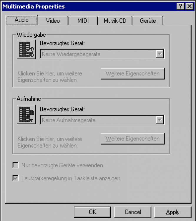 Yes. Double Click does nothing. Right Click gives me: Sound Manager (not working) Multimedia (see screenshot in posting above) Windows Media Player (Starting but no file to test, yet) Sound Recorder (Error Message: Record/Play not working because no Audiodevice installed; Sound Recorder itself loads afterwards) Volume Control (not working) Exit (working) -