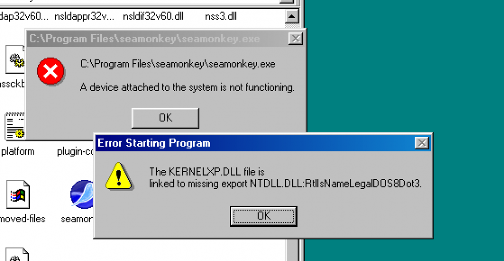 Let me try it and report to you in a couple of minutes. I've installed Firefox 9.0.1, It still has the wrong system fonts all over the UI, but its working somewhat and I don't know how. EDIT: For SeaMonkey 2.28, I need MSVCR100.DLL, it's complaining about this missing DLL. I don't know where to get km75rc3 either. EDIT 2: Got the DLL from my Win2K VM. Now complains about KernelXP.DLL and NTDLL.DLL... I definitely need to start using dependency walker.