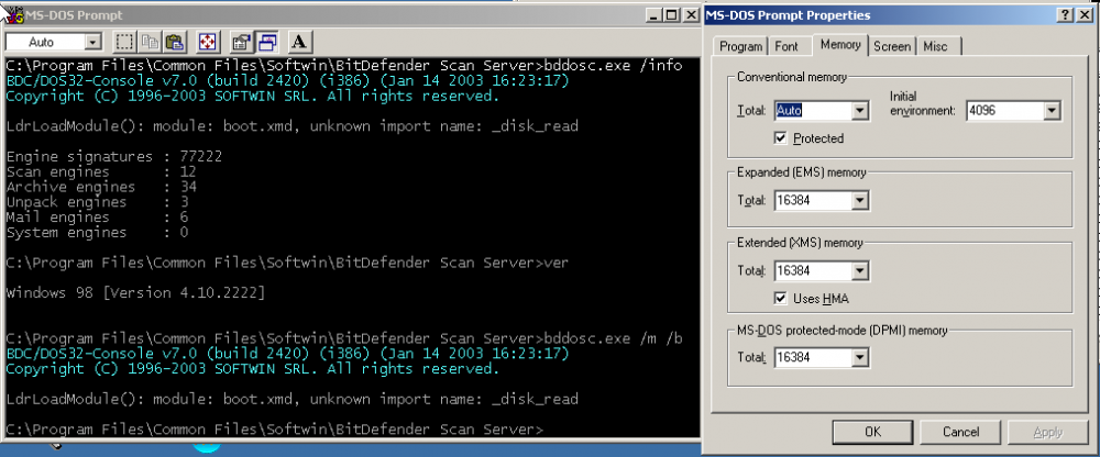 I tried to find a current virus scanner for DOS other than clamAV. I found that there are was a free bitdefender MSDOS edition until 2004. But it's impossible for me to find that distribution, which was at last freeware. I didn't managed to get bdcdos.zip, bd.rar or kit_msdosedition.zip from any site on the web. I managed to find out, that bddosc.exe was part of eg. bitdefender Professional 7.2-11 (bitdefender_prof_v72-11.exe). But it crashes when using it under DOSbox or vDOSplusED in certain cases. Also I'm not sure, if it really uses the updates downloaded from that version installed in Windows 98 virtualbox (6.1). The update process updates, but closes with an error message, but in the plugins folder it downloaded a bunch of new files from the current bitdefender upgrade server. Though I didn't tried yet to run it in a FreeDOS virtualbox VM. Here some output of the program iarsin@win10 /cygdrive/c/vDosPlusEd/AV/bitdefender/BitDefender Scan Server (win98, updates 20210214, bitdefender pro v7.2-11) $ dir 7ffa.gz* avxdisk.dll* avxt.dll* bdc.ini* bddosc.exe* bdupd.dll* label.dat* Plug.gz* plugins.htm* avxc00.exe* avxs.dll* bdc.exe* bdcore.dll* bdss.exe* CWSDPMI.EXE* libfn.dll* Plugins/ tmp382454f2/ iarsin@win10 /cygdrive/c/vDosPlusEd/AV/bitdefender/BitDefender Scan Server (win98, updates 20210214, bitdefender pro v7.2-11) $ file bddosc.exe bddosc.exe: MS-DOS executable, COFF for MS-DOS, DJGPP go32 DOS extender iarsin@win10 /cygdrive/c/vDosPlusEd/AV/bitdefender/BitDefender Scan Server (win98, updates 20210214, bitdefender pro v7.2-11) $ ./bddosc.exe /? bash: ./bddosc.exe: Kann die Binärdatei nicht ausführen: Exec format error iarsin@win10 /cygdrive/c/vDosPlusEd/AV/bitdefender/BitDefender Scan Server (win98, updates 20210214, bitdefender pro v7.2-11) $ cmd /c bddosc.exe /? Die Version von C:\vDosPlusEd\AV\bitdefender\BitDefender Scan Server (win98, updates 20210214, bitdefender pro v7.2-11)\bddosc.exe ist mit der ausgeführten Windows-Version nicht kompatibel. Überprüfen Sie die Systeminformationen des Computers, und wenden Sie sich anschließend an den Herausgeber der Software. Windows 98 MS-DOS Prompt C:\Program Files\Common Files\Softwin\BitDefender Scan Server>ver Windows 98 [Version 4.10.2222] C:\Program Files\Common Files\Softwin\BitDefender Scan Server>bddosc.exe /? [... (?)] Usage: bddosc.exe path[s] [parameters] Parameters: /f, /files scan files * /R, /nor do not recurse /r, /arc scan archives /p, /prompt prompt for action /i, /mail scan mail databases /O, /info information /d, /dis disinfect files /W, /nowarn no warnings /h, /nohed no heuristics /V, /vlist display virus list /G, /log[=file] create log file /infext=ext set rename extension /I, /list log all files /l, /del delete infected files /a, /all scan all files /ren rename infected files /e, /app append to log file /?, /help this help /T, /tmp=path set temporary path * = default option /k, /nopack don't scan packed programs /F, /inf=path set infected quarantine folder /E, /ext=ext1;ext2; scan only this extensions /X, /xcl=ext1;ext2; exclude from scan this extensions /U, /sup=path set suspected quarantine folder /alev[=n] set maximum archive depth level /y, /copys copy suspect files in quarantine folder /o, /copy copy infected files in quarantine folder /move move infected files in quarantine folder /moves move suspect files in quarantine folder /flev[=n] set maximum folder depth level C:\Program Files\Common Files\Softwin\BitDefender Scan Server> C:\Program Files\Common Files\Softwin\BitDefender Scan Server>bddosc.exe . BDC/DOS32-Console v7.0 (build 2420) (i386) (Jan 14 2003 16:23:17) Copyright (C) 1996-2003 SOFTWIN SRL. All rights reserved. LdrLoadModule(): module: boot.xmd, unknown import name: _disk_read Warning: no scan option defined; using defaults /files Results: Folders :3 Files :213 Packed :0 Infected files :0 Suspect files :0 Warnings :0 I/O errors :0 Scan time :00:00:02 Kbytes/s :0 Files/s :106 C:\Program Files\Common Files\Softwin\BitDefender Scan Server>bddosc.exe * BDC/DOS32-Console v7.0 (build 2420) (i386) (Jan 14 2003 16:23:17) Copyright (C) 1996-2003 SOFTWIN SRL. All rights reserved. LdrLoadModule(): module: boot.xmd, unknown import name: _disk_read Results: Folders :1 Files :213 Packed :0 Infected files :0 Suspect files :0 Warnings :0 I/O errors :0 Scan time :00:00:02 Kbytes/s :0 Files/s :106 C:\Program Files\Common Files\Softwin\BitDefender Scan Server>bddosc.exe /info BDC/DOS32-Console v7.0 (build 2420) (i386) (Jan 14 2003 16:23:17) Copyright (C) 1996-2003 SOFTWIN SRL. All rights reserved. LdrLoadModule(): module: boot.xmd, unknown import name: _disk_read Engine signatures : 77222 Scan engines : 12 Archive engines : 34 Unpack engines : 3 Mail engines : 6 System engines : 0 C:\Program Files\Common Files\Softwin\BitDefender Scan Server>bddosc.exe /m /b BDC/DOS32-Console v7.0 (build 2420) (i386) (Jan 14 2003 16:23:17) Copyright (C) 1996-2003 SOFTWIN SRL. All rights reserved. LdrLoadModule(): module: boot.xmd, unknown import name: _disk_read C:\Program Files\Common Files\Softwin\BitDefender Scan Server>bddosc.exe /r /m / b /f C: BDC/DOS32-Console v7.0 (build 2420) (i386) (Jan 14 2003 16:23:17) Copyright (C) 1996-2003 SOFTWIN SRL. All rights reserved. LdrLoadModule(): module: boot.xmd, unknown import name: _disk_read C:/WINDOWS/TEMP/ ... 93.clamtmp/tar11 infected: EICAR-Test-File (not a virus) [... lost lines] eax=02f10e00 ebx=00104b38 ecx=00af2bda edx=034c76d8 esi=00158fff edi=036206d0 ebp=001024a0 esp=00102494 program=C:\PROGRA~1\COMMON~1\SOFTWIN\BITDEF~1\BDDOSC.E XE cs: sel=00a7 base=840d1000 limit=0372afff ds: sel=00af base=840d1000 limit=0372afff es: sel=00af base=840d1000 limit=0372afff fs: sel=0087 base=000100f0 limit=0000ffff gs: sel=00c7 base=00000000 limit=0010ffff ss: sel=00af base=840d1000 limit=0372afff App stack: [00109428..00089428] Exceptn stack: [0008937c..0008743c] Call frame traceback EIPs: 0x000327e1 0x02f4af52 0x02f526f7 0x02f514a1 0x02f510b3 0x02f44859 0x02f539fe 0x00012229 0x0001193c