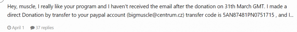 Hey, muscle, I really like your program and I haven’t received the email after the donation on 31th March GMT. I made a direct Donation by transfer to your paypal account (bigmuscle@centrum.cz)