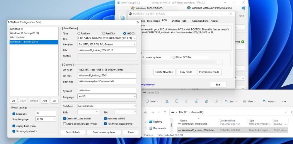 WinNTSetup 5.1.12 is not working with the latest Windows 11 build 22543.1000 (x64) Iso image generated on uup dump site. Installing windows into vhd just as with previous builds, no tweaks used/not unattended. On boot gives error 0xc0000225, cannot boot.